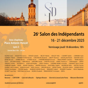 Sous un chapiteau installé Place Antonin Poncet, une cinquantaine d’artistes de l’Académie Lyonnaise de Peinture exposent leurs créations originales : 1 grand tableau + 2 petits (de format 30 X 30 cm).